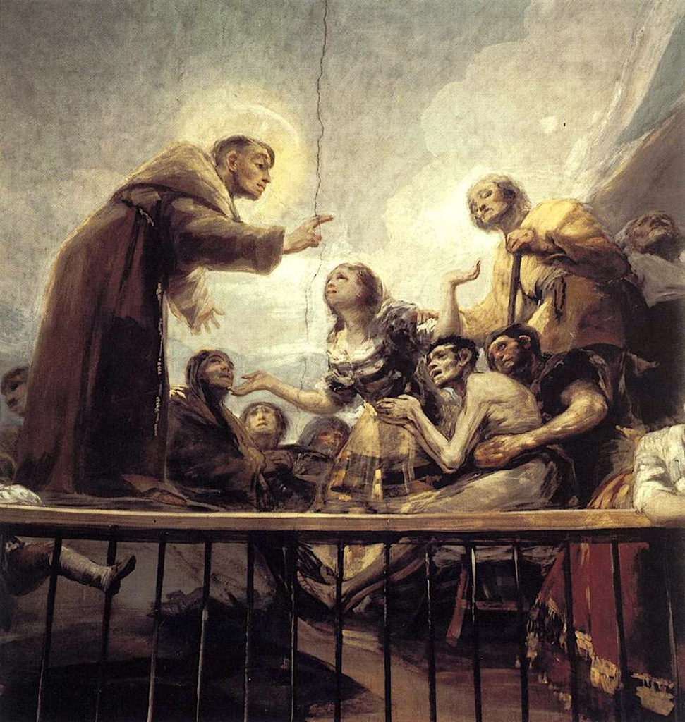 El verdadero corazón de la obra es la multitud que presencia el milagro en la cúpula. Goya traslada el evento de la Lisboa medieval al Madrid de finales del siglo XVIII. No hay trajes de época ni arquitecturas portuguesas. El paisaje de fondo es esquemático, casi un telón teatral de la sierra madrileña bajo un cielo azul intenso.