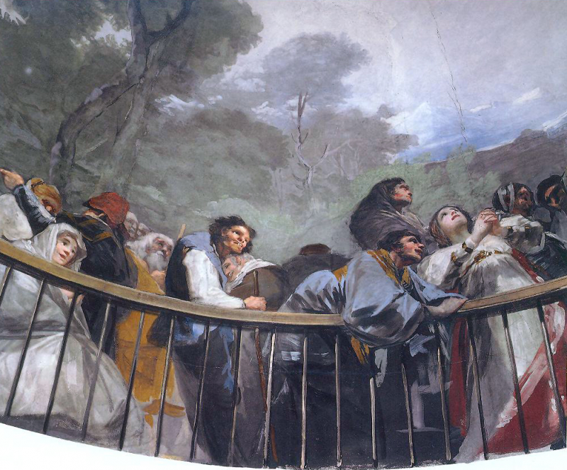 Goya sitúa esta escena narrativa y dramática en la cúpula. El espectador, al mirar hacia arriba, no ve una visión divina, sino que se convierte en testigo ocular de un evento que sucede en un espacio físico continuo al suyo. Para acentuar este realismo, Goya pintó una barandilla fingida (trampantojo) que rodea la base de la cúpula, tras la cual se agolpa la multitud. Es una perspectiva de abajo hacia arriba ejecutada con maestría.
