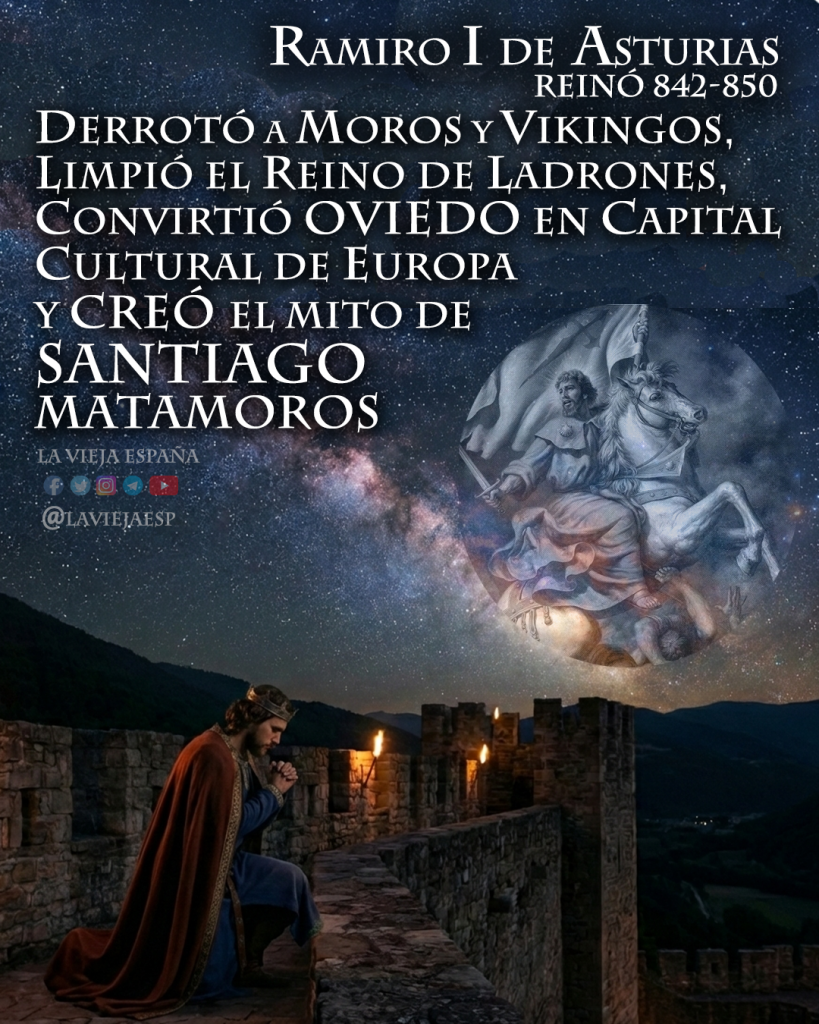 El reinado de Ramiro I de Asturias, Vara de la Justicia, representa uno de los periodos más críticos y, a la vez, transformadores del Reino de Asturias. Fue un reinado breve de apenas ocho años, pero Intenso. Brutal cuando fue necesario, devoto por convicción y un estratega que entendió que Asturias debía expandirse o morir. Durante su reinado, Asturias pasó de ser un foco de resistencia montañés a consolidarse como una potencia militar y la dotó de una identidad mística, ligada para siempre al origen del culto a Santiago como patrón de la guerra. Detuvo a los vikingos, mantuvo a raya a los moros, limpió el reino de ladrones y nos dejó los monumentos más bellos de la Alta Edad Media española.